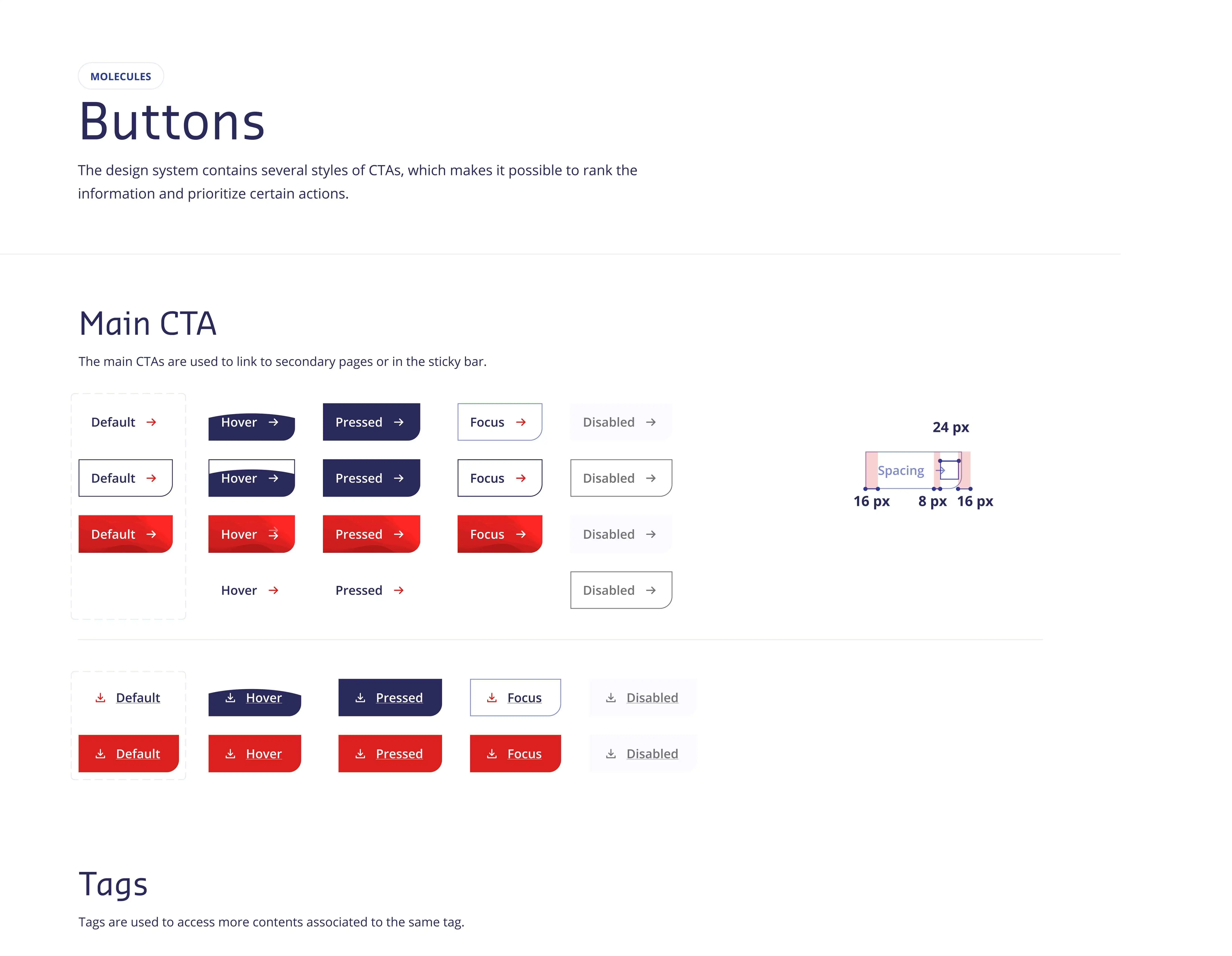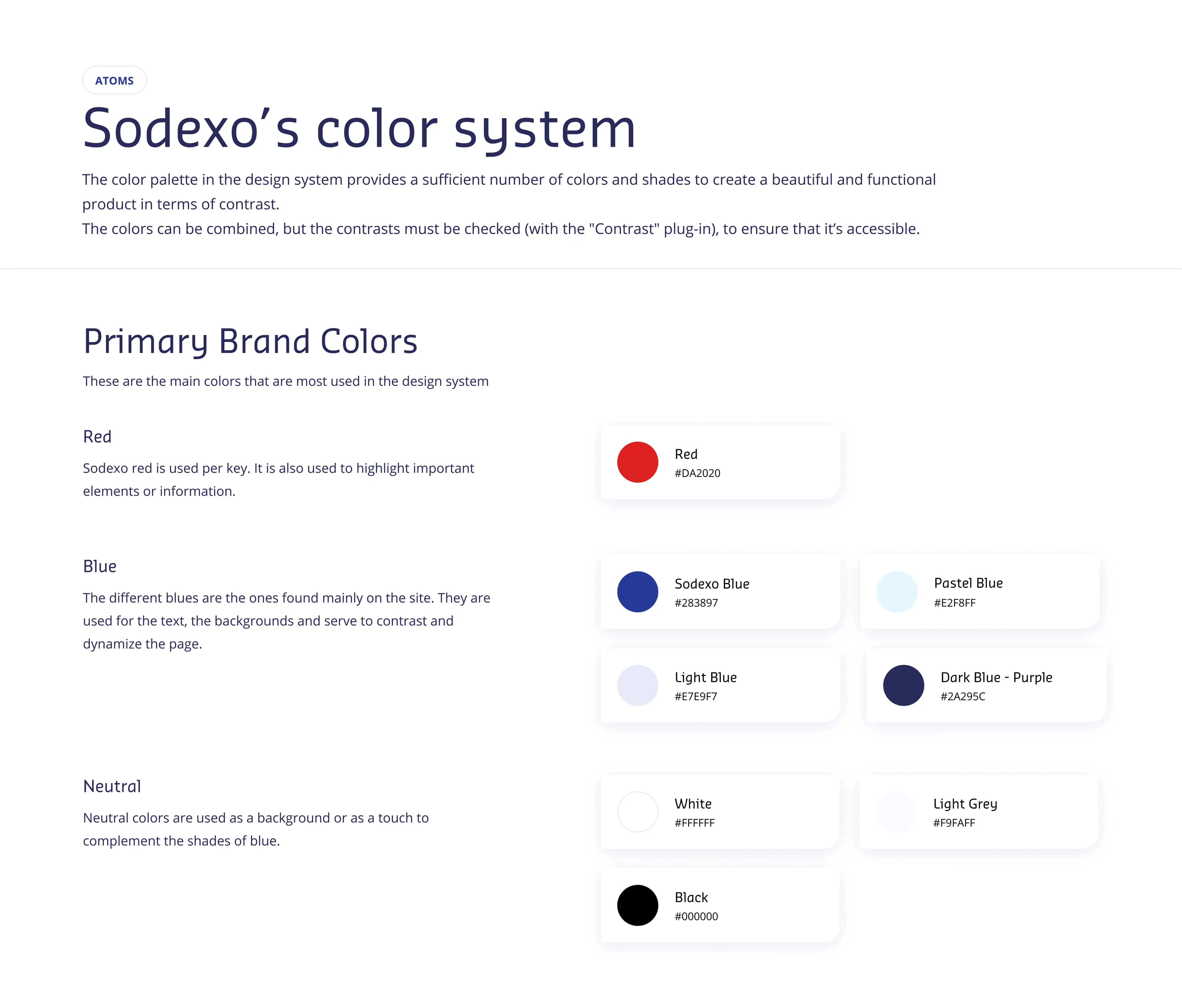 Integrating the design system, I used Sodexo's color palette, components, grid, spacers, typography, icons, and more for consistency and cohesion in the website's visual design. These predefined elements streamline the design process and ensure a harmonious aesthetic across all pages. This enhances brand recognition and facilitates efficient collaboration and scalability. Below are examples of the elements used: